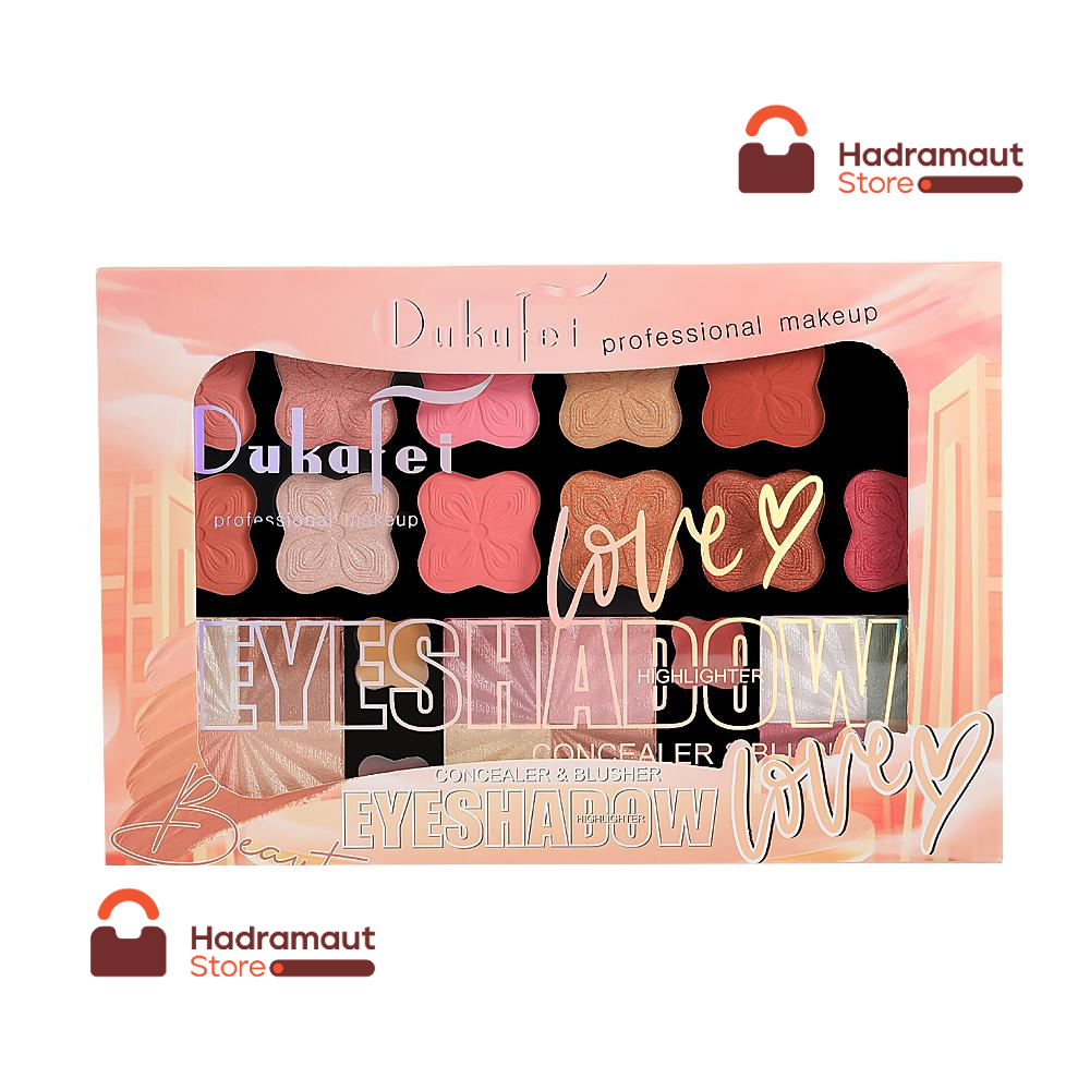 باليت “Dukafei” للميك أب بروفيشنال تحتوي على ظلال عيون (EYESHADOW) بألوان متنوعة من البني والوردي والبيج، بالإضافة إلى هايلايتر